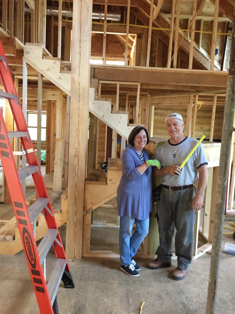 I’ve been helping a friend rebuild his log home in Pigeon Forge, TN – the original was destroyed by the 2016 fires. My project this week was a U-shaped staircase centered around a midway landing. A few weeks before the build, I developed a model in Google Sketchup and with the help of a construction calculator was able to design a plan to work from. Complicating the project was the fact that no finished floors were in place, so that meant we had to decide on the thickness of material to eventually use on the floors and the landing. Once that was decided, I punched the actual numbers into the calculator which helped determine the stringer layout. We cut the upper stringers and installed them, then calculated the thicknesses of the landing sub-floor and finished floor. From that I determined the height of the landing which we then built. Then it was a snap to run the lower stringers. We will eventually use oak stair treads and landing flooring, but for now we just installed treads from scrap lumber to be used while the other trades are still working. A real treat was seeing a bear at a house just below where we were working.