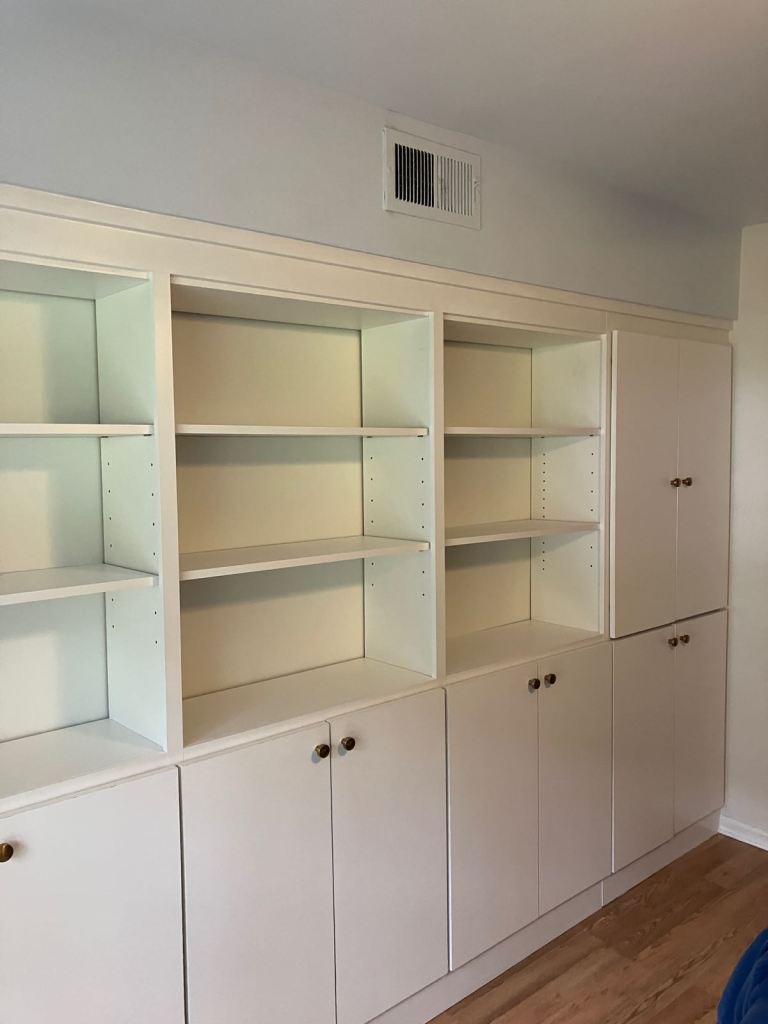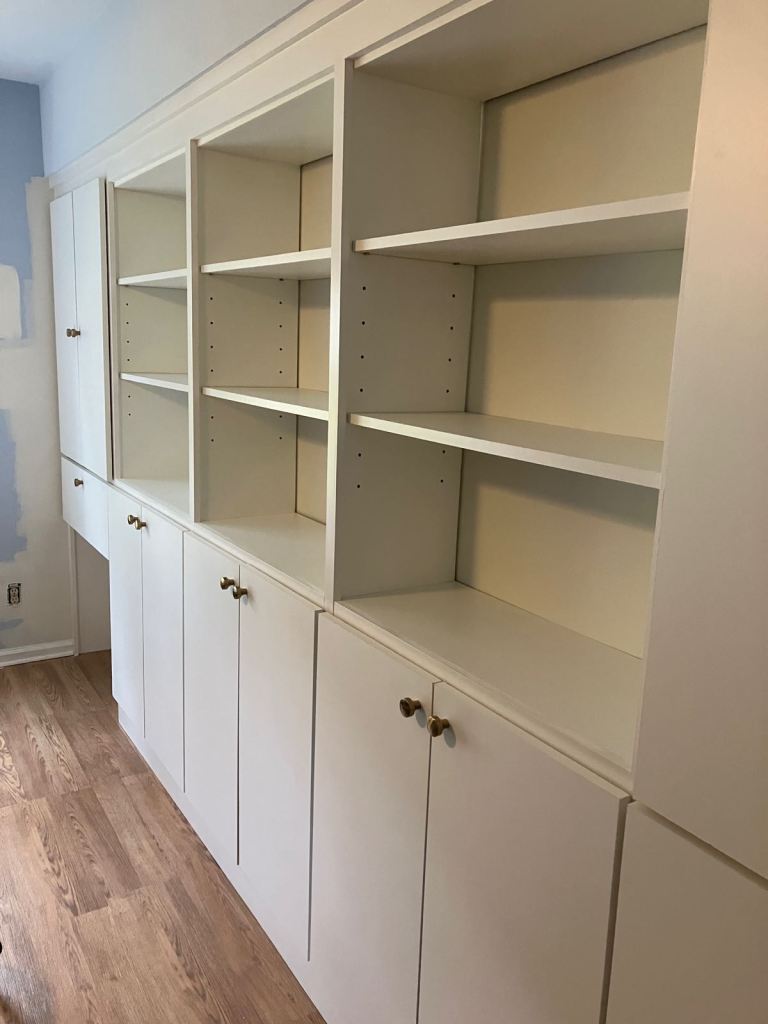 It contains plenty of closed storage, adjustable shelves, and a drop-down shelf for her laptop. It is roughly 14 feet long and 7 feet high and was made entirely from Melamine boards for durability and clean-ability.