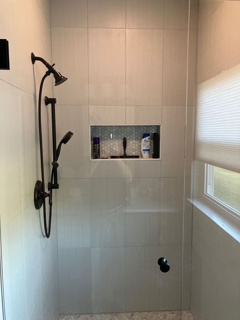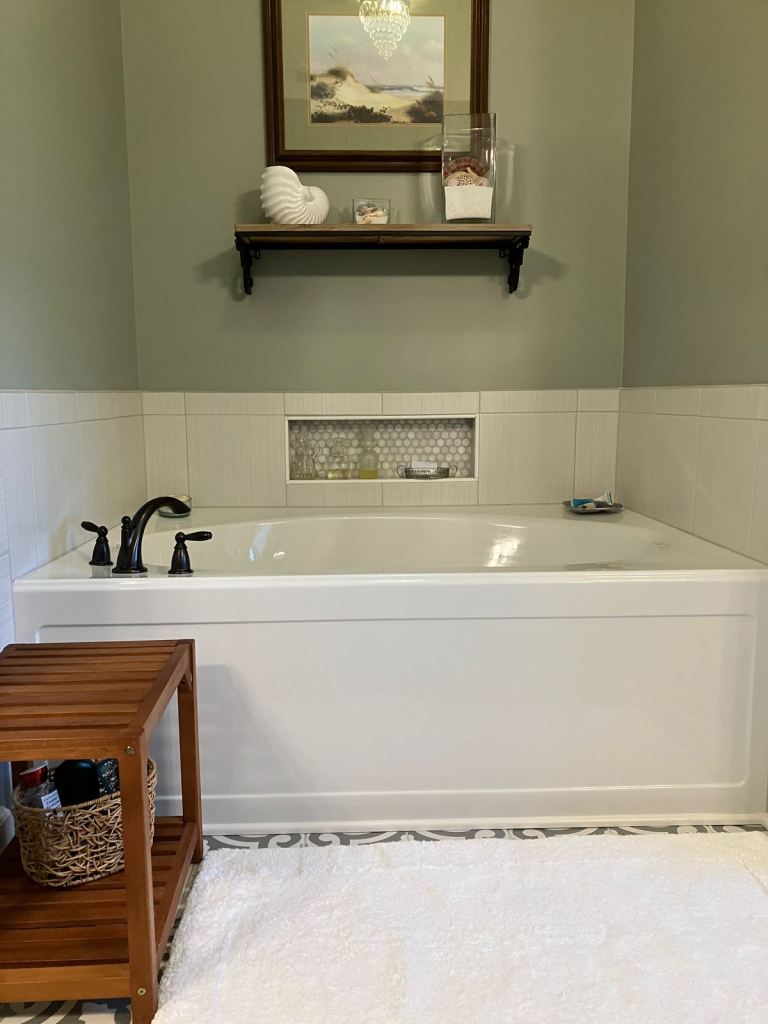 We recently remodeled our bath – new tub, ADA toilet, tile floor, shower enclosure, light fixtures, and new plumbing fixtures. The shower area was enlarged to a true 48″ x 48″ and involved relocating the drain and valve to be correctly centered. I built 2 vanities, each with 6 under-mount drawers made from Maple Veneer drawer side stock purchased from Nashville Plywood. More details on the next page…
